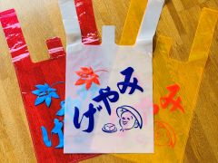 鈴木さんデザインのエコバッグは、白いボディに味のある毛筆風の書体で書かれた「みやげ」という青色のロゴ、そしてもみじ、笑顔の小僧さん、豆腐のイラストが入っています。これは……観光地で買ったお土産を入れてもらうレジ袋だ!