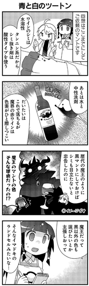 シミ抜きは化学。でも、キャラクターはファンタジー(左:1巻第2着「バンパイアは血に染まらない」、右:1巻第1着「魔王のマントはワインの香り」より)