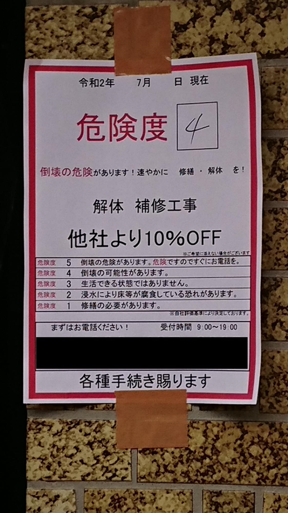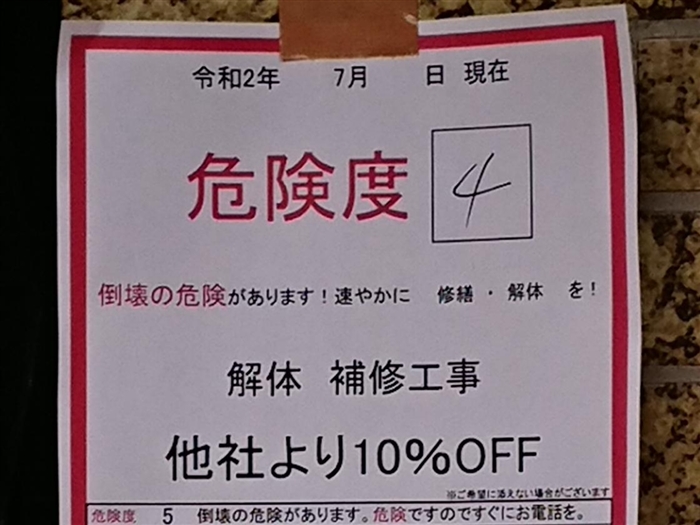 サンプルとして実際の張り紙の写真も公開。5段階の危険度で「危険度4 倒壊の可能性があります」とした上で、「解体 補修工事 10%OFF」「まずはお電話ください」と自社の宣伝につなげる内容となっています。