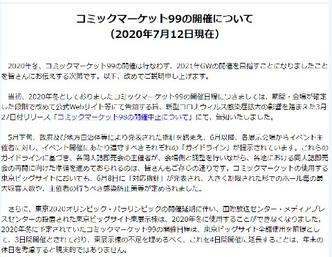「『コミックマーケットは同人誌を中心としてすべての表現者を受け入れ、継続することを目的とした表現の可能性を拡げるための「場」である』ことを理念に掲げるにもかかわらず2020年の1年間、リアルな『場』としてのコミックマーケットを開催できないことは、我々準備会にとっても痛恨事に他なりません。しかしながら、コミックマーケットは、規模の大きさ故に社会的影響も考慮しつつ、継続を旨として慎重に事を進めていきたいと考えています。今後も開催継続に向け、最善を尽くして参りますので、参加者・関係者の皆さんには、重ねてのご理解・ご協力をいただければ幸いです」(準備会)