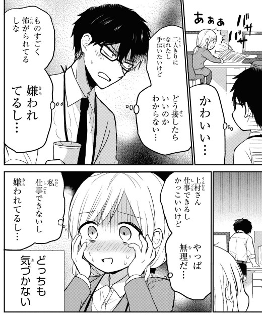 上村くんに怒られてばかりの森下さん。実は上村くんは森下さんに癒やしを感じ、森下さんは仕事ができる上村くんをカッコいいと思っている――のですが、お互い「怖がられている」「仕事ができないから嫌われている」と思い込んでいます。