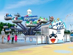「シーチキンGO!」は、「シーチキン号」をモチーフにした14台の乗りカゴ(2人乗り)が空中を回転する約2分間のアトラクションです。 手元のレバーの操作で上昇や下降の操作も可能。14台の「シーチキン号」はそれぞれ違った表情をしており、夜になったら目が光るなど、ビジュアル面の面白さも追求しているようです。