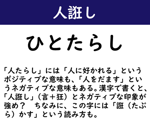 「人たらし」には「人に好かれる」というポジティブな意味も、「人をだます」というネガティブな意味もあるが、漢字にすると「人誑し」(言+狂)とネガティブな印象が強まる。ちなみに、「誑(たぶら)かす」もこの漢字で書ける。