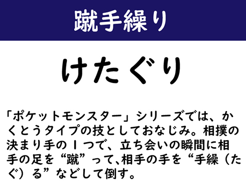 「ポケットモンスター」シリーズでは、かくとうタイプの技としておなじみ。相撲の決まり手の1つで、立ち会いの瞬間に相手の足を“蹴”って、相手の手を“手繰(たぐ)る”などして倒す。