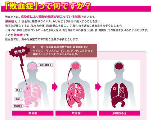 日本集中治療医学会らによる情報サイト「敗血症.com」によれば、敗血症とは「感染症により臓器の障害が起こっている状態」「(感染症に対する体の)防御反応がコントロールできなくなり、自分自身の体の臓器(心臓、肺、腎臓など)が障害を受ける」。日本国内で1年間に、推定約10万人が亡くなっているという。