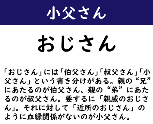 「おじさん」には「伯父さん」「叔父さん」「小父さん」という書き分けがある。親の“兄”にあたるのが伯父さん、親の“弟”にあたるのが叔父さん。要するに「親戚のおじさん」。それに対して「近所のおじさん」のように血縁関係がないのが小父さん。