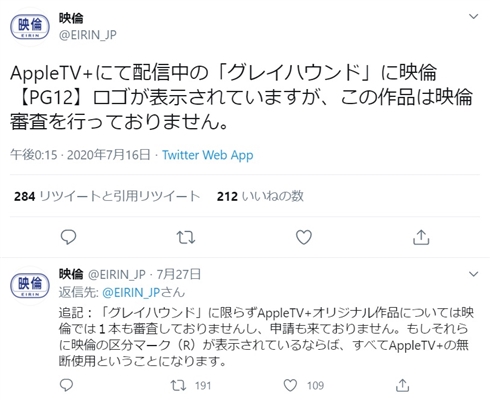 「グレイハウンド」はもともと劇場公開予定の作品でしたが、新型コロナウイルスの影響でApple TV+での独占配信になった経緯があります。映倫は、当初の配給元であるソニー・ピクチャーズにも問い合わせたそうですが、作品が既にApple側の手に移っていることから協力は得られなかったとのこと。こうして、苦渋の選択としてTwitterでの告知に踏み切ったそうです。