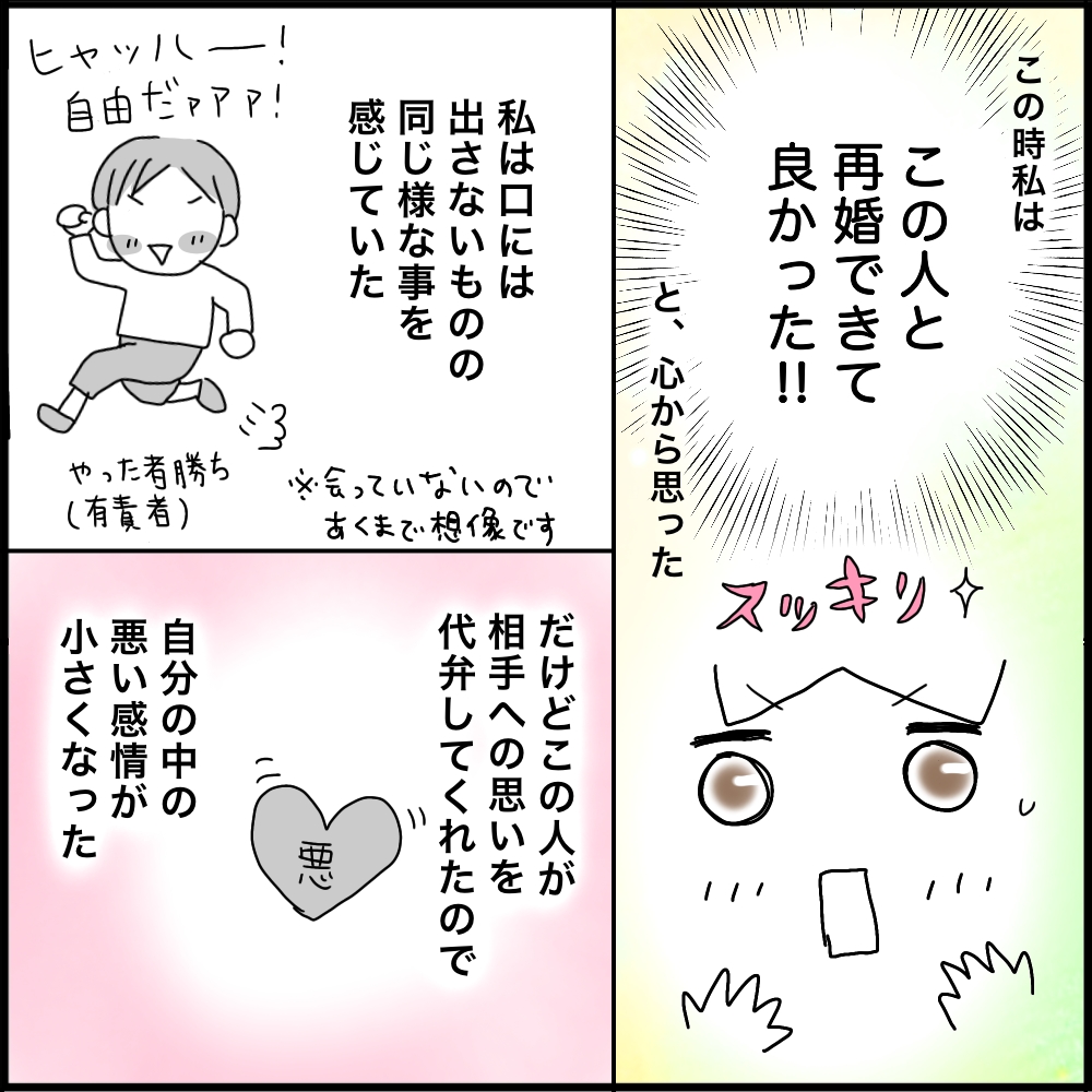 でもそんなとき、少し(物理的に)距離を取りつつ、夫があのとき言ってくれた言葉と、あのとき感じた「再婚できてよかった」という気持ちを思い出します。そうすると、結婚して良かったなぁ、やっぱり憎めないなと思えるのでした。