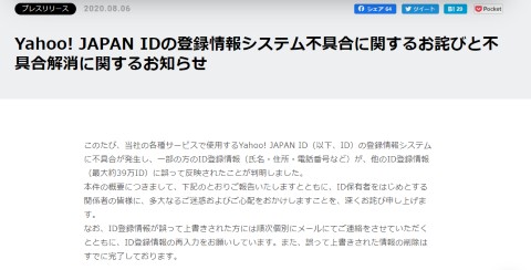Yahoo! JAPAN IDの登録情報が、別の人のIDに反映される問題が発生しました。