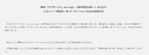 漫画『アクタージュ act-age』の原作者マツキタツヤさんの逮捕を受けて、同作の舞台版「アクタージュ act-age 〜銀河鉄道の夜〜」の中止が発表されました。