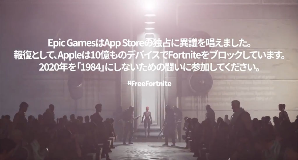 抗議映像は日本語でも公開されており、それによると「Epic GamesはApp Storeの独占に異議を唱えました。報復として、Appleは10億のデバイスでFortniteをブロックしています」「2020年を『1984』にしないための闘いに参加してください」とのこと。映像自体も、過去にAppleが放映したCM「1984」のパロディーで、Appleによる“独占体制”を強烈に皮肉ったものでした。また、それから数時間後にはAndroid版アプリもGoogle Playストアから削除されています。