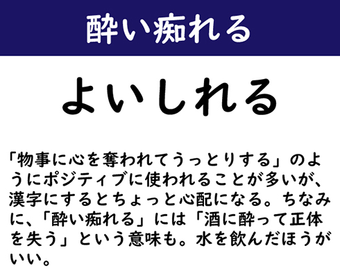 「物事に心を奪われてうっとりする」のようにポジティブに使われることが多いが、漢字にするとちょっと心配になる。ちなみに、「酔い痴れる」には「酒に酔って正体を失う」という意味も。水を飲んだほうがいい。