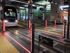 駅構内に路面電車の停留場がある珍しい構造になっており、電車が来ると左右の柱と床面に内蔵したLEDライトが赤く光り、「電車が来ます、渡らないでください」というアナウンスが流れるという仕組み。Twitterの投稿には「かっこいい」と好評で、映画「スター・ウォーズみたい」という声もありました。