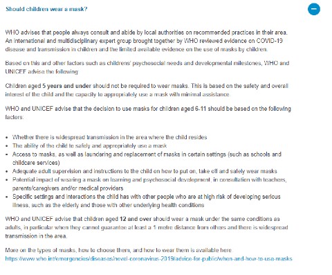 世界保健機構(WHO)は8月21日に子どものマスク着用に関する指針を公開しました。「5歳以下の子どもはマスクを着用する必要はない」「12歳以上は大人と同様に着用するべき」などの指針を示しています。