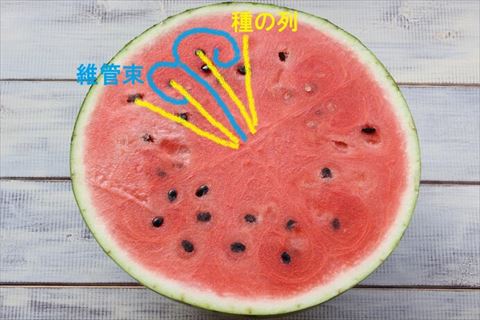 そこで、種を一気に取るためには、まず丸いスイカを切る時に、シマシマに対して垂直方向に切ります。つまり、軸を上にしてスイカを置いた場合、シマシマを断ち切るように水平方向に切って2等分にするのです。すると、断面に、先がクルッとカールしている維管束が走っているのが見えると思います。