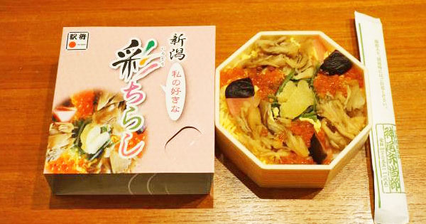 発売から10年以上、平時は新潟駅でも見かける、すっかり定番のちらし寿し駅弁です。