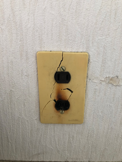起床後、いつも通りにベッドを畳んでいたら目の端に光が見え、よく見るとコンセントから煙が上がり、焦げついていました。