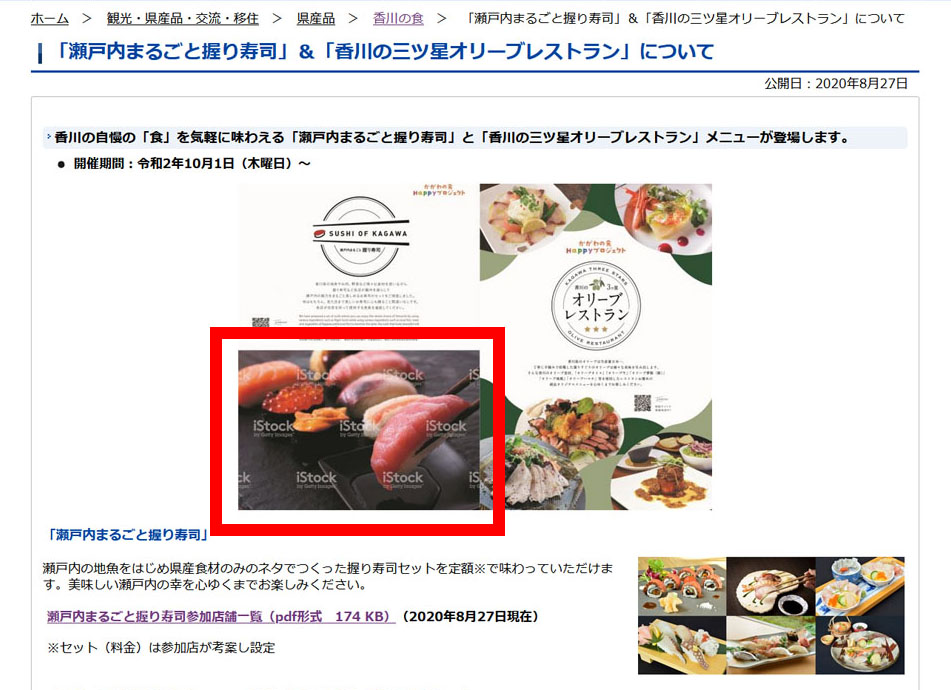 発端となったのは、香川県が8月27日に掲載した「『瀬戸内まるごと握り寿司』&『香川の三ツ星オリーブレストラン』について」というお知らせ。当初、ページ上部にはおいしそうな“すしの写真”が掲載されていたのですが、写真をよく見ると「iStock」(有料の写真素材販売サービス)の透かしがデカデカと……。その後画像は削除されましたが、Twitterでは「香川県が著作権ガン無視でウォーターマークつけっぱなし画像をプレスリリースに使ってる」「仕事が雑」など批判の声があがっていました。