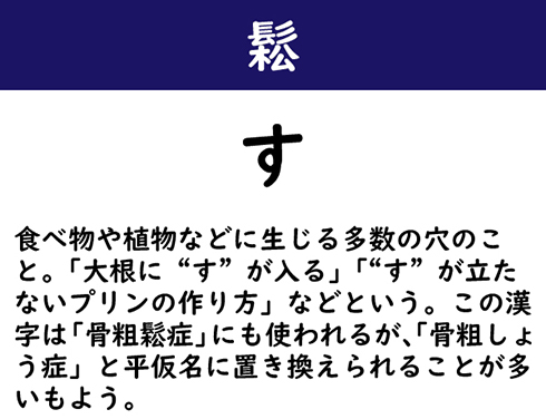 食べ物や植物などに生じる多数の穴のこと。「大根に“す”が入る」「“す”が立たないプリンの作り方」などという。あまり使われない漢字のためか、「骨粗鬆症」の場合も「骨粗しょう症」と平仮名に置き換えられることが多いもよう。