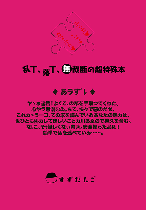 コミックマーケット96(2019年夏)にて頒布した『この作者、天邪鬼につき』は、「鬼人正邪」という天邪鬼(あまのじゃく)なキャラクターが、実際に本の中で縦横無尽に暴れ回るといったストーリーになっております。したがいまして、通常の本ではあり得ない乱丁・落丁・無裁断をはじめとした、さまざまな「嫌がらせ」が次々と読者に襲いかかる仕組みになっております(読者の皆さまは刃物をご用意し、本を切り進めながら読んでいただく必要がございます)。
