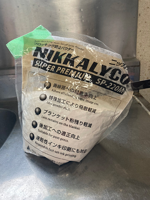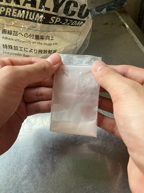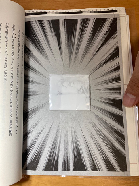 完成版が刷り上がった後も、本文中にパケ(麻薬)を模した真っ白な粉末を仕込む作業があり、具体的に言うと、業務用コンスターチ(※)をスプーンひとさじ分すくい上げ、透明なチャック袋に入れては、指定のページにセロハンテープで貼り付ける作業を1冊1冊やっていきました。