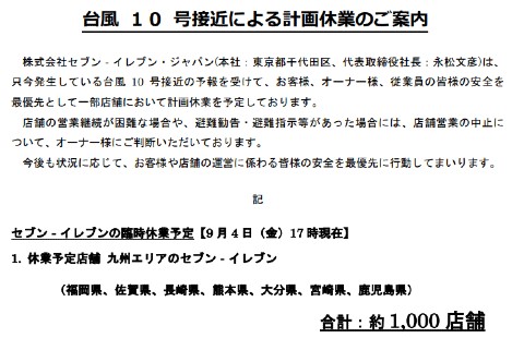 セブン-イレブンは台風10号の接近予報を受けて、九州エリアの一部店舗で計画休業を行うと発表しました。