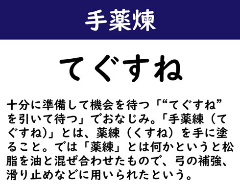 十分に準備して機会を待つ「“てぐすね”を引いて待つ」でおなじみ。「手薬練(てぐすね)」とは、薬練(くすね)を手に塗ること。では「薬練」とは何かというと松脂を油と混ぜ合わせたもので、弓の補強、滑り止めなどに用いられたという。