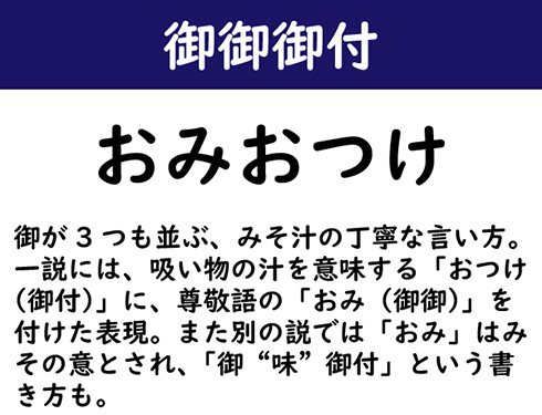 御が3つも並ぶ、みそ汁の丁寧な言い方。一説には、吸い物の汁を意味する「おつけ(御付)」に、尊敬語の「おみ(御御)」を付けた表現。また別の説では「おみ」はみその意とされ、「御“味”御付」という書き方も。