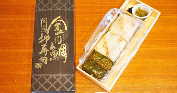 黒地に金文字で「金目鯛押寿司」と書かれ、高級感あるパッケージとなっていますね。