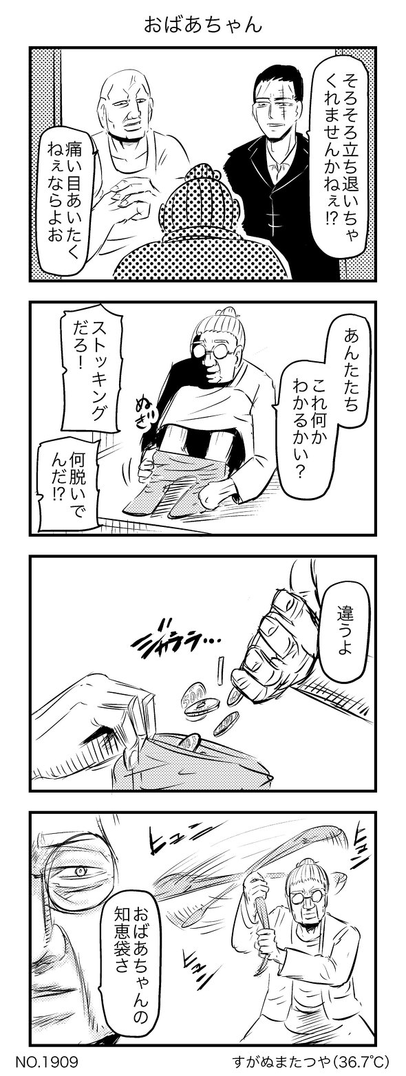悪党に脅されるおばあちゃんが披露した「知恵袋」とは……? 意外な展開を見せる4コマ漫画が笑いを誘います。