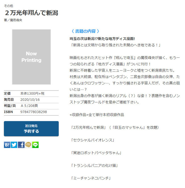 魔夜峰央さんの短編集『2万光年翔んで新潟』が10月16日に小学館クリエイティブより刊行されます。埼玉の次にディスられるのは作者の出身地・新潟……!