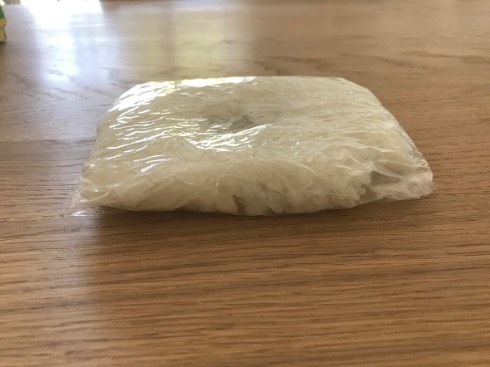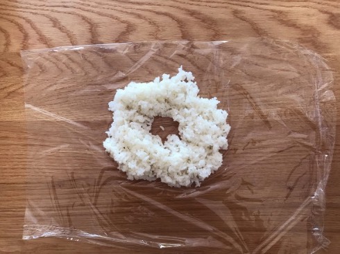 ツイートにあったとおり、炊いたごはんをリング状に盛り、薄くなるよう軽く押さえながらラップで包みます。比較対象として、同じくらいの量のご飯を普通にラップに包んだものも用意しました。粗熱がとれたらそのまま冷凍庫で一晩凍らせ、実験の準備は完了。