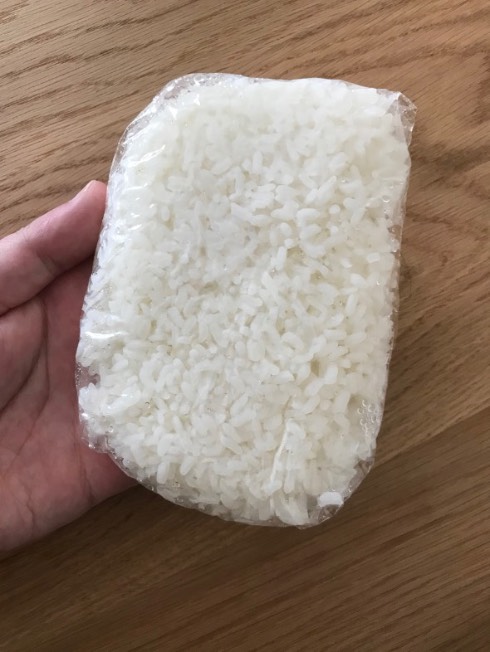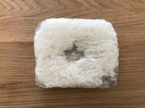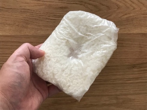 完全に凍るまで一晩冷凍庫で寝かせ、次の日に取り出してみます。当然ながらご飯はカチカチ