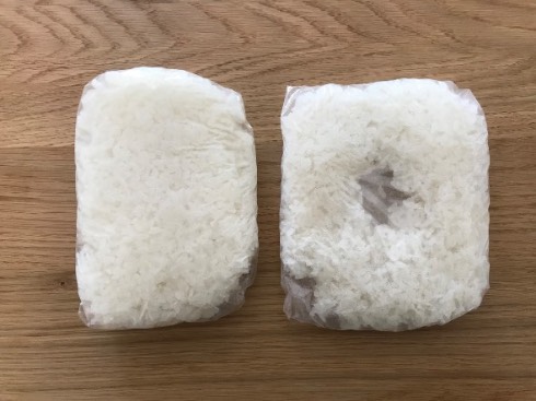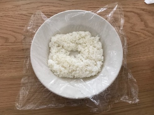 比較対象として、大体同じくらいの量のご飯を普通にラップに包んだものも用意。粗熱がとれたらそのまま冷凍庫へ