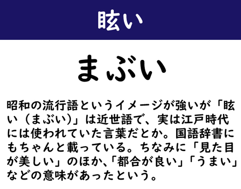 昭和の流行語というイメージが強いが「眩い(まぶい)」は近世語で、実は江戸時代には使われていた言葉だとか。国語辞書にもちゃんと載っている。ちなみに「見た目が美しい」のほか、「都合が良い」「うまい」などの意味があったという。
