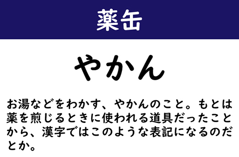 お湯などをわかす、やかんのこと。もとは薬を煎じるときに使われる道具だったことから、漢字ではこのような表記になるのだとか。