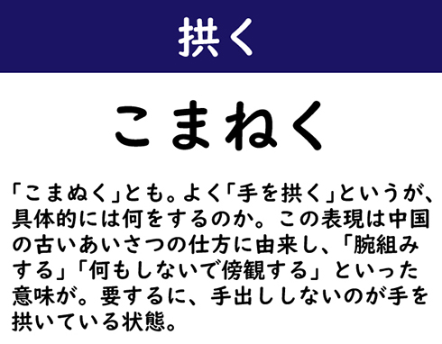 「こまぬく」とも。よく「手を拱く」というが、具体的には何をするのか。この表現は中国の古いあいさつの仕方に由来し、「腕組みする」「何もしないで傍観する」といった意味が。要するに、手出ししないのが手を拱いている状態。