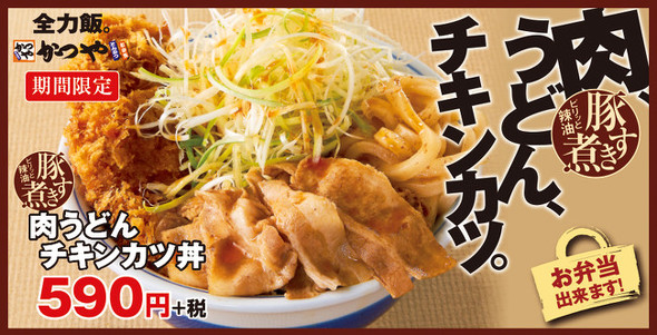 かつやは10月2日より、全力でおかずを盛り合わせた丼「豚すき煮肉うどんチキンカツ丼」を期間限定で販売します。価格は590円(税別)。