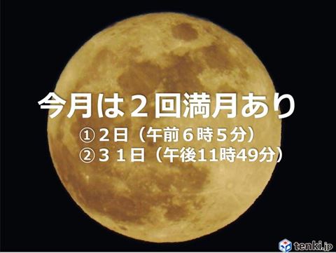 2日は満月。時刻は午前6時5分と、過ぎてしまいましたが、今夜もほぼ真ん丸の月を見ることができそうです。また、今月はブルームーンとも呼ばれる2回目の満月もあります。