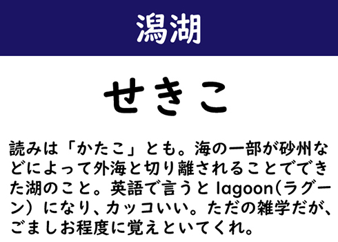 海の一部が砂州などによって外海と切り離されることでできた湖のこと。潟(かた)、潟湖(かたこ)とも。そして、英語で言うとlagoon(ラグーン)となり、カッコいい。ただの雑学だが、ごましお程度に覚えといてくれ。