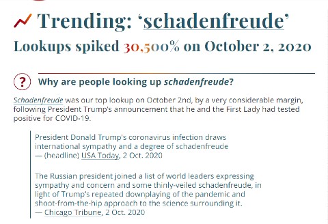 Merriam-Websterは、トランプ大統領とメラニア夫人の感染発表後にschadenfreudeの検索が急増したと報告。メディアで「トランプ大統領の感染が国際的な同情とある程度のschadenfreudeを呼んだ」「ロシアの大統領が同情と心配、うっすらと見えるschadenfreudeを表す」といったように報じられており、多くの人がニュースで見て気になった言葉を調べたとみられます。