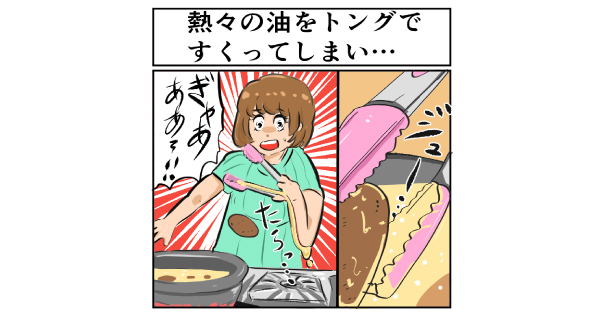 唐揚げを揚げる際にこちらのトング(画像参照)でひっくり返すなどしていたのですが、手が滑った拍子にトングの先の部分でスプーンのように熱い油をすくってしまい、手の甲から肘にかけて油をかぶってしまいました。