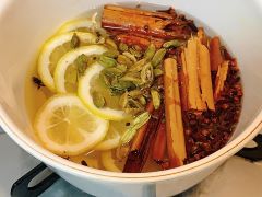 基本の材料となるスパイスは、シナモン、クローブ、カルダモンの3種類です。このほか、砂糖やレモンなどを入れ、沸騰するまで鍋で煮ていきます。