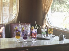 脚付きグラスのラインアップは「ラプソディー」「マスカレード」「風船」「コレック」「野ばな」の全5種。お花や風船のプリントがキュートです。ミルクセーキとかメロンソーダとかを入れて飲みたくなるな……!
