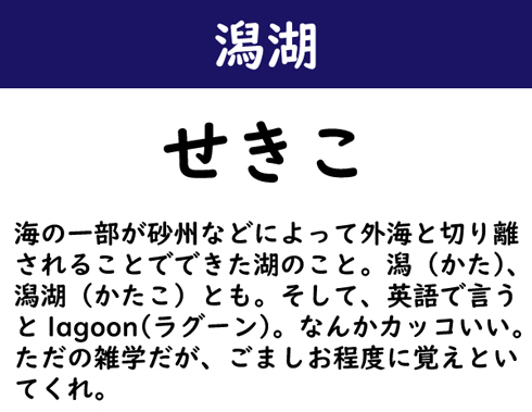 海の一部が砂州などによって外海と切り離されることでできた湖のこと。潟(かた)、潟湖(かたこ)とも。そして、英語で言うとlagoon(ラグーン)。なんかカッコいい。ただの雑学だが、ごましお程度に覚えといてくれ。