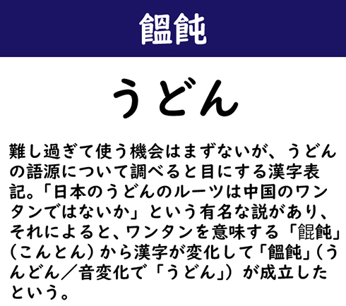 難し過ぎて使う機会はまずないが、うどんの語源について調べると目にする漢字表記。「日本のうどんのルーツは中国のワンタンではないか」という有名な説があり、それによると、ワンタンを意味する「○飩」(こんとん/○は食へんに昆)から漢字が変化して「饂飩」(うんどん/音変化で「うどん」)が成立したという。