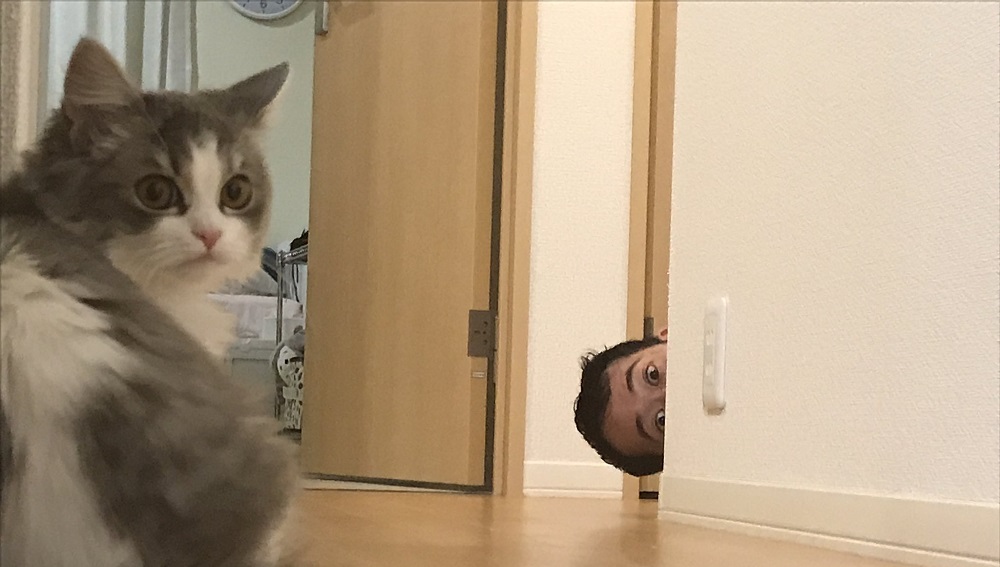 猫ちゃん側から見てみると、下からにゅっと出てきた旦那さんはほとんどホラー(!)。そんな飼い主の謎の行動を前に、困った表情で後ろを振り返り、どぅんたさんに「……ニャにこれ……?」と聞くような猫ちゃんの姿がかわいいです。そして同時に旦那さんのカメラ目線が強すぎる……!