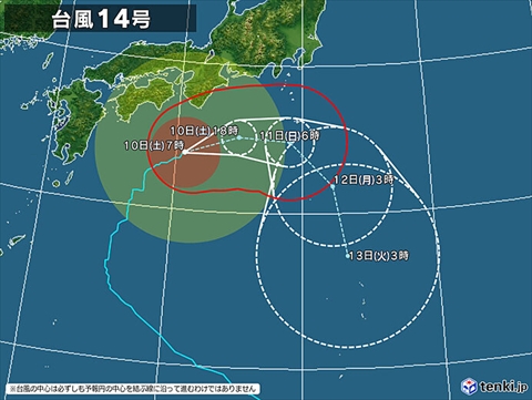 きょう10日は、本州の南にある台風14号が次第に東よりに進み、伊豆諸島に近づいてくるでしょう。伊豆諸島では、すでに3日ほど雨が続いており、降り始めからの雨の量が500ミリを超えている所があります。これからあすにかけて台風に伴う発達した雨雲がかかるため、土砂災害の危険が高まるおそれがあります。暴風や高波にも警戒が必要です。