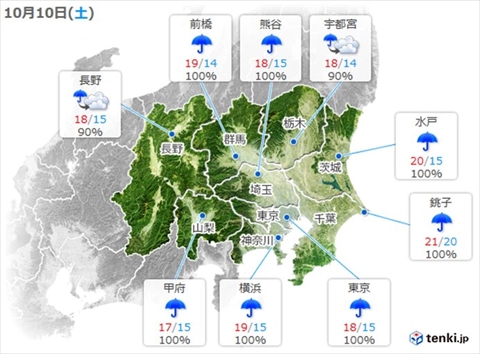 10日の関東 台風14号が南の海上へ 本降りの雨 沿岸部は風も強まる