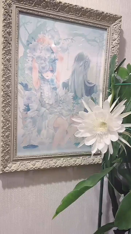 そしてついに、年に数回、たった一夜だけ咲く白く美しい花と、貴重な開花中の様子を撮影することに成功。背景には作品の絵も飾られ、ツイートでは月下美人の花言葉の1つである「はかない恋」を添えています。いずれも花の雰囲気に合っており、だんだんと大きく開いていく花とが相まって深い感動を覚えます。